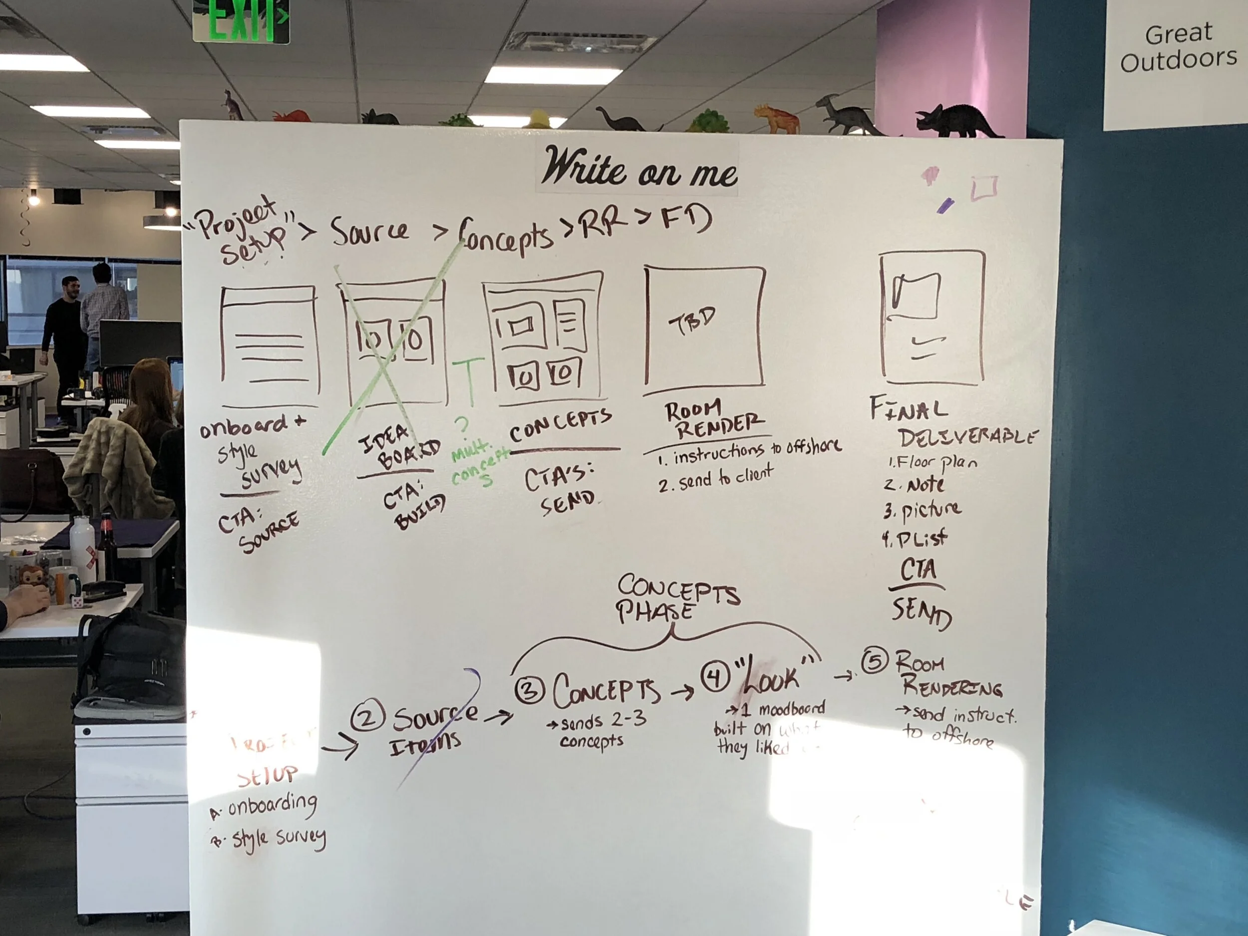 Defining the project phases - I teamed up with another product designer and our in-house interior designers to whiteboard out the designer’s workflow. At the end of the session, we were able to agree upon a user flow.